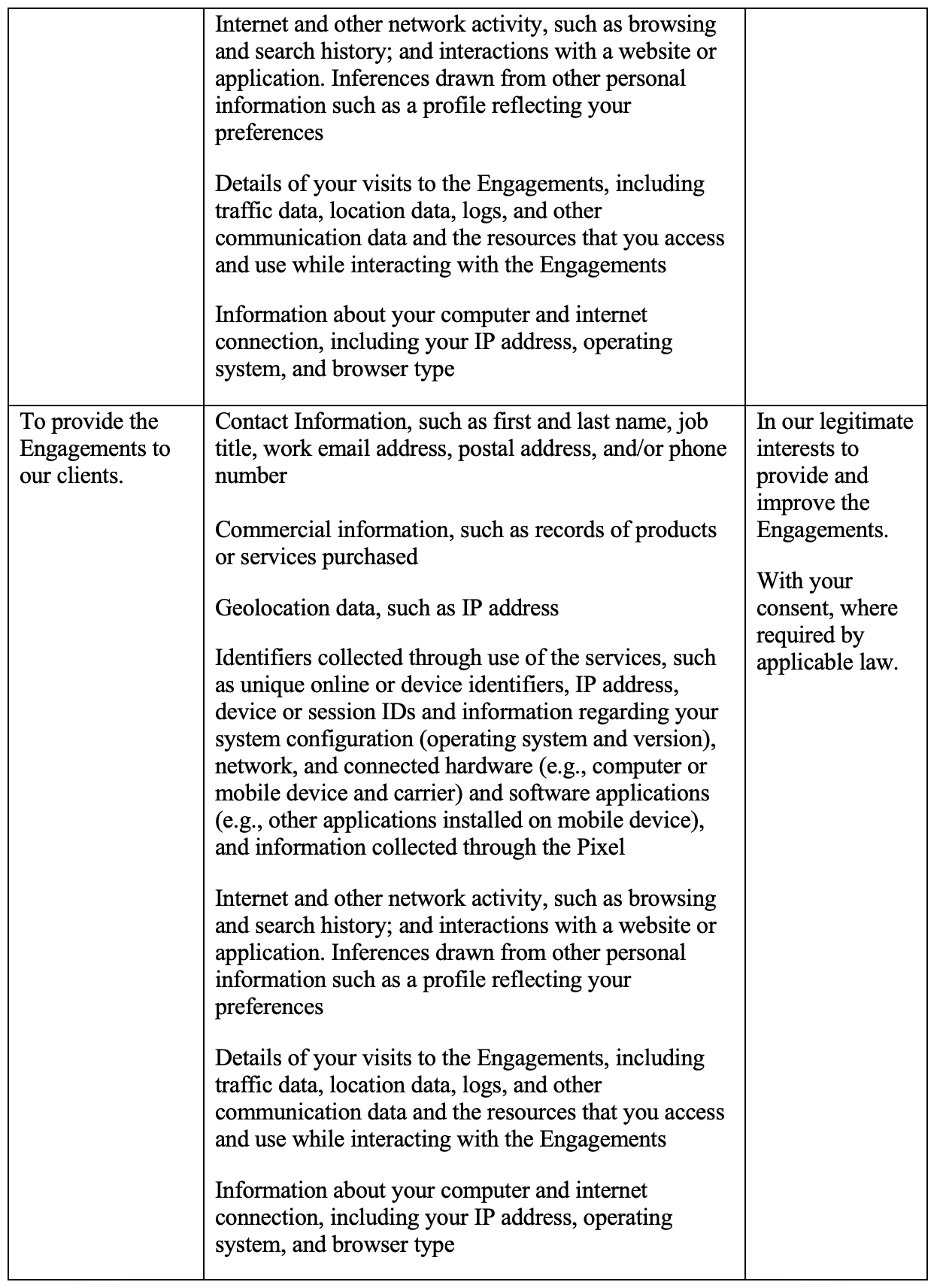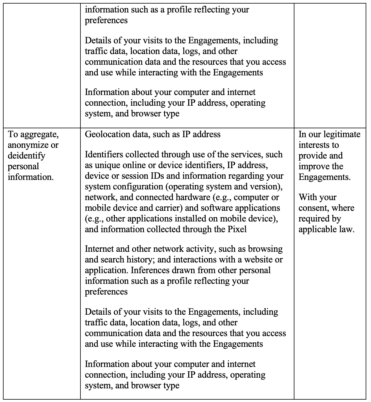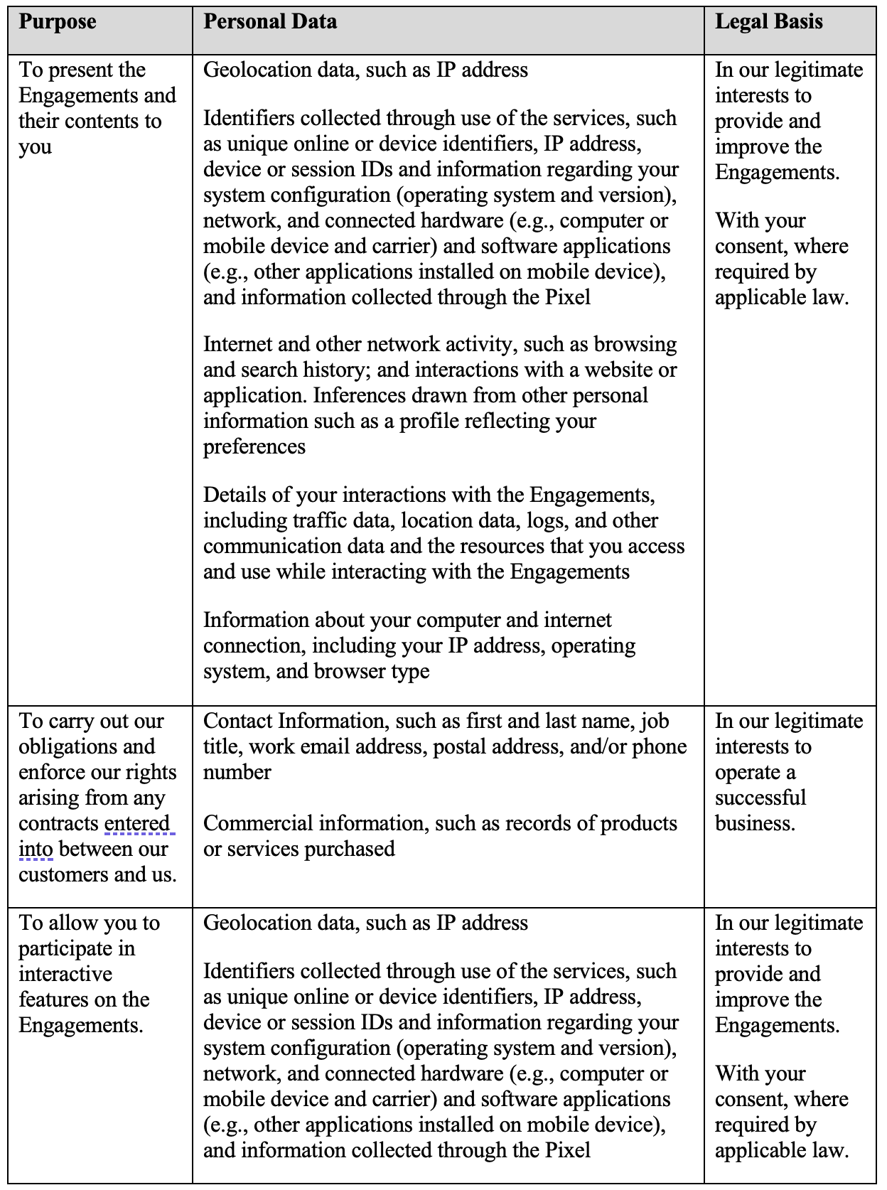 In compliance with the European Union (“EU”) General Data Protection Regulation (“GDPR”) and United Kingdom (“UK”) General Data Protection Regulation (“UK GDPR”), we rely upon the following legal basis defined in the GDPR and UK GDPR to collect, use, share, and otherwise process the personal information of individuals located in the EU or UK: